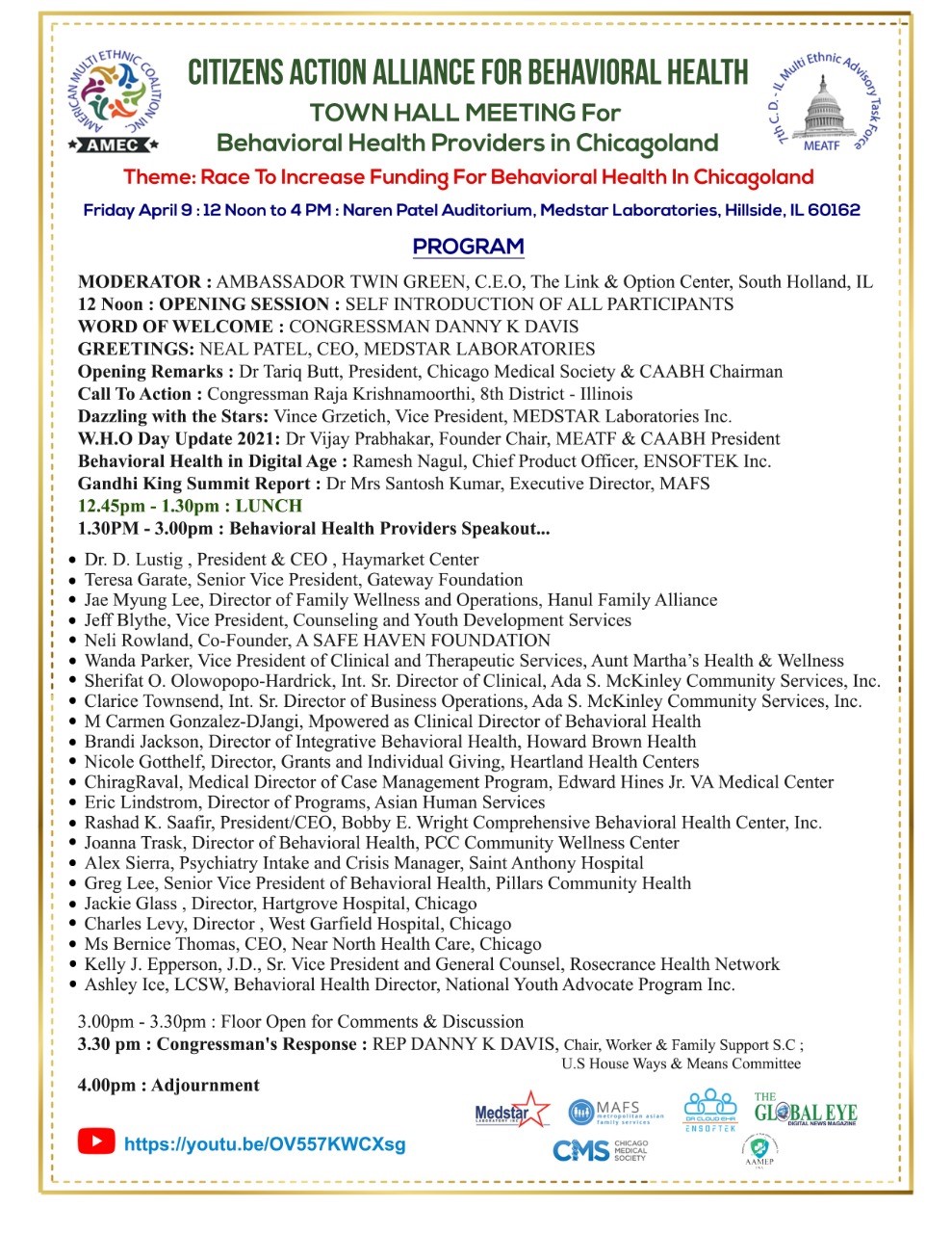 “Race to Increase Funding for Behavioral Health in Chicagoland” is the topic of this upcoming Town Hall Meeting organized by Citizens Action Alliance for Behavioral Health and hosted by Illinois Congressmen Danny K. Davis (7th District) and Raja Krishnamoorthi (8th District). America is in turmoil, and a mental health crisis looms next. The rising demand for behavioral health and human services and the lack of equitable access to mental health care are critical issues that need immediate attention, understanding, and funding.